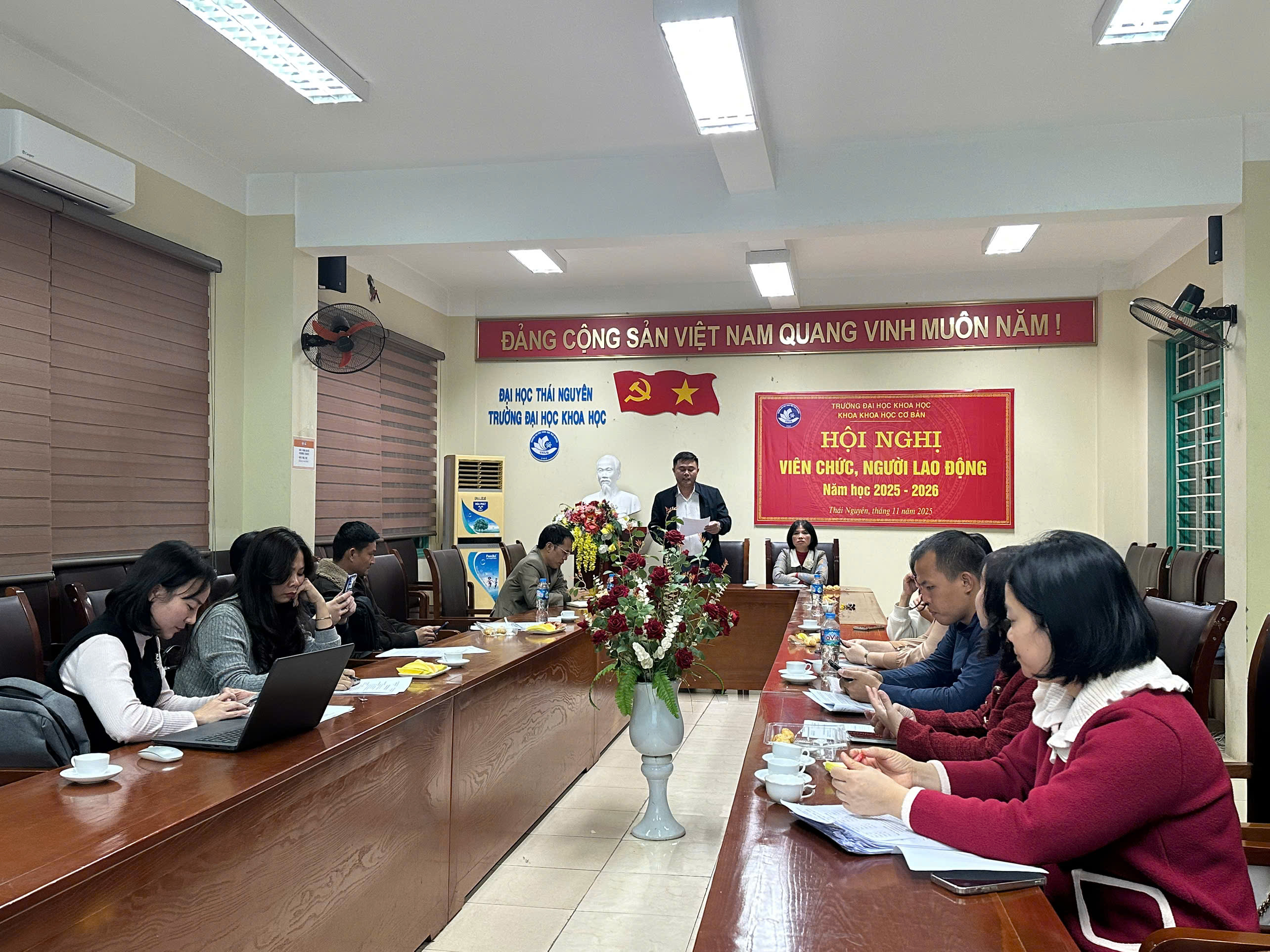 Ngày 27/11/2025, Khoa Khoa học Cơ bản - Trường Đại học Khoa học, Đại học Thái Nguyên đã long trọng tổ chức Hội nghị Cán bộ, Viên chức và Người lao động năm 2025. Hội nghị nhằm đánh giá toàn diện kết quả thực hiện nhiệm vụ trong năm, đồng thời đề ra phương hướng, mục tiêu cho năm 2026.